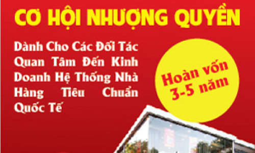 Với hệ thống quản lý chuyên nghiệp, phục vụ ân cần, món ăn ngon, giá cả hợp lý, chúng tôi vô cùng vui mừng và tự hào giới thiệu đến quý vị mô hình kinh doanh nhượng quyền độc đáo và hấp dẫn. Hiện nay, chúng tôi đang tìm kiếm đối tác Nhượng quyền thương hiệu quan tâm đến kinh doanh hệ thống nhà hàng tiêu chuẩn quốc tế.